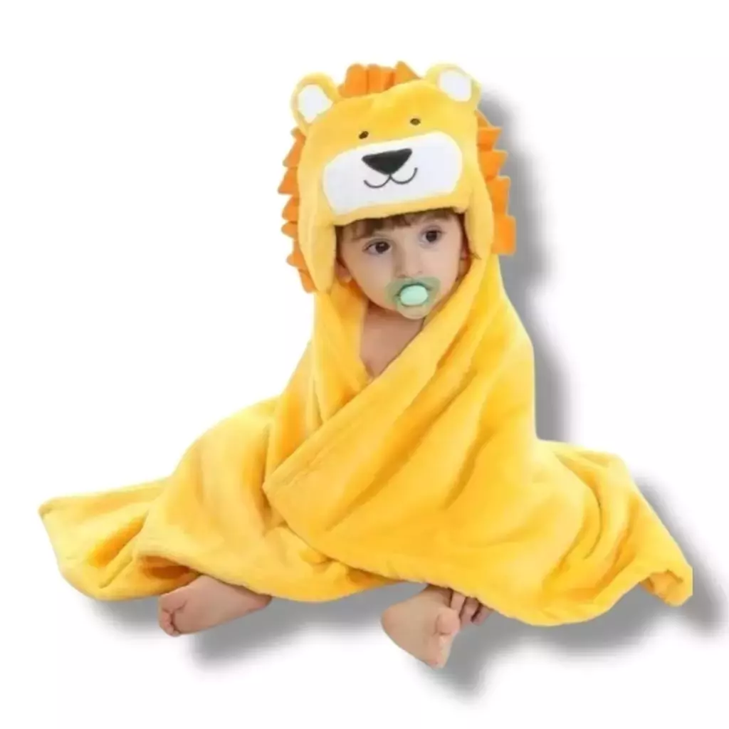 Frazada tipo flannel con capucha de animalitos, ideal para bebés y niños hasta 6 años. Suave, liviana y de tamaño compacto para usar en la cuna, cochecito o sillón.