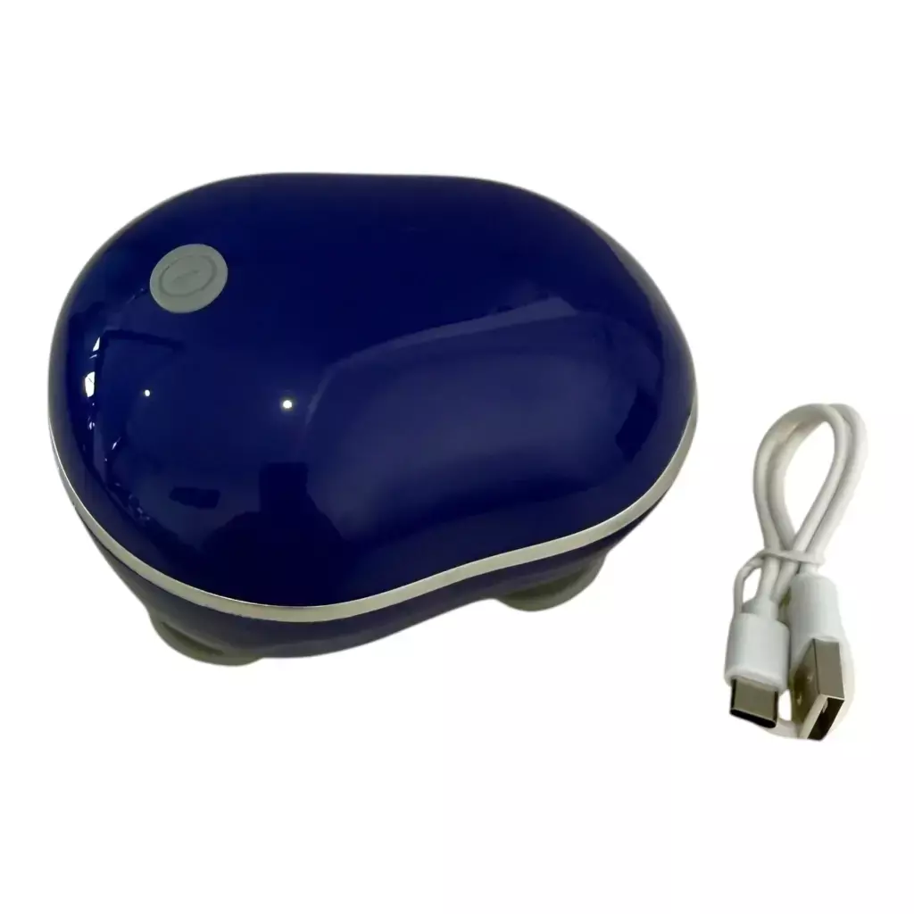 🧱 Materiales: Carcasa superior de plástico rígido (ABS) en acabado azul brillante con borde decorativo plateado. Los 4 cabezales de masaje son de silicona gris, flexible y suave al tacto para no lastimar la piel.